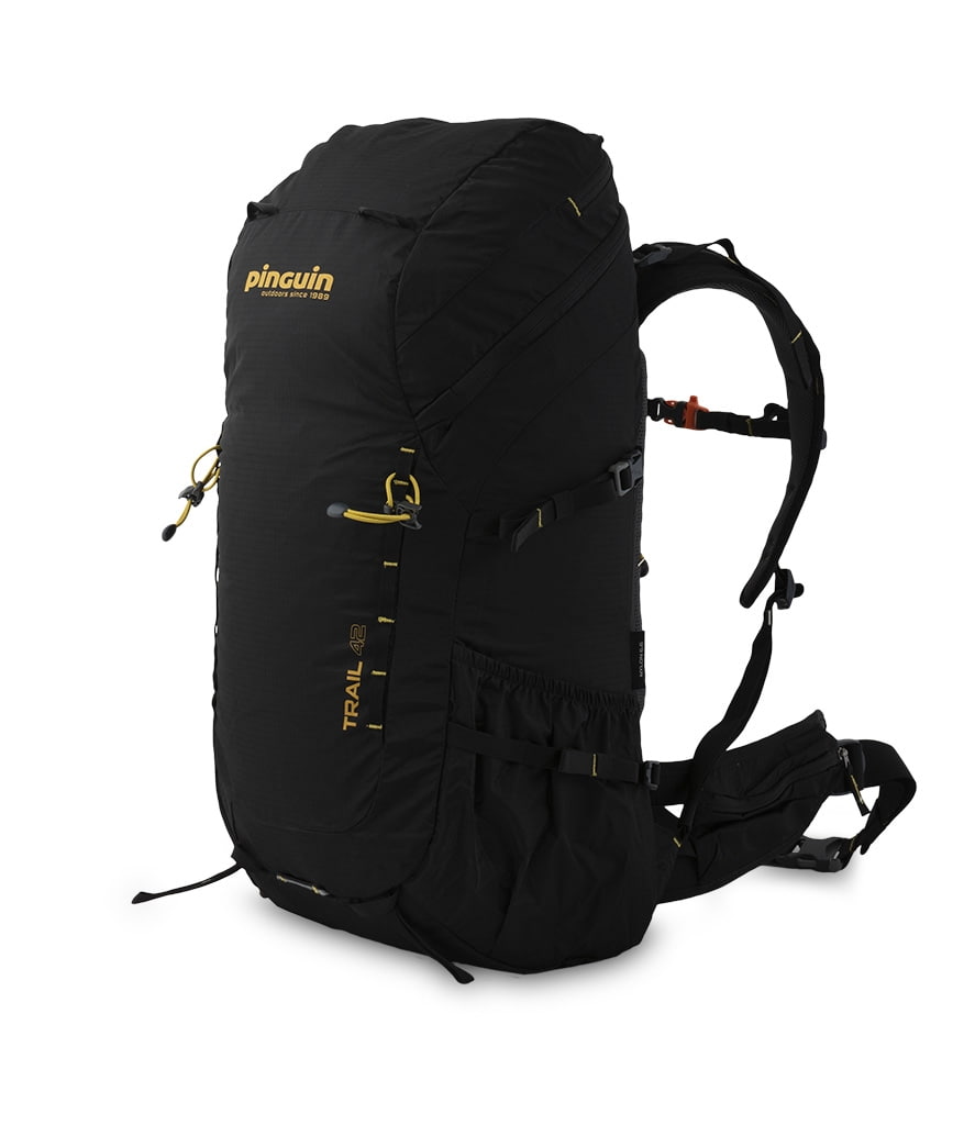 Batoh na turistiku Pinguin Trail 42 - jednokomorový batoh se zádovým systémem E3D, který udržuje těžiště batohu co nejblíže zad a zajišťuje jejich maximální odvětrání. Záda batohu jsou vyztužena vyjímatelnou HPDE deskou s integrovanou duralovou výztuží. Vstup je atypicky přes zip ve vrchní části. Hodí se na turistiku a cestování. Pinguin Trail 42 má stavitelné ramenní popruhy se zesíleným polstrováním v ramenní části. Dvě boční síťované kapsy na láhve. Dva boční kompresní popruhy. Batoh má odnímatelný vrchlík. Čelní zipová kapsa, strečové boční kapsy, poutka pro uchycení trekových holí, odnímatelná výztuha zad, reflexní poutko na blikačku v dolní části batohu.