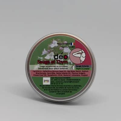 Tuhý deodorant Deo Šalvěj a Tymián od francouzské značky Boma Vám zaručí pocit svěžesti po celý den. Používá se pouze při dermální aplikaci. Působí jako deodorant tím, že reguluje pocení a neutralizuje množení bakterií. Hydrogenuhličitan sodný neutralizuje kyselost vedoucí k rozvoji bakterií. Kukuřičný škrob je savý a změkčuje. Esenciální olej ze šalvěje muškátové je adstringentní. Linalool tymiánový esenciální olej je antibakteriální.