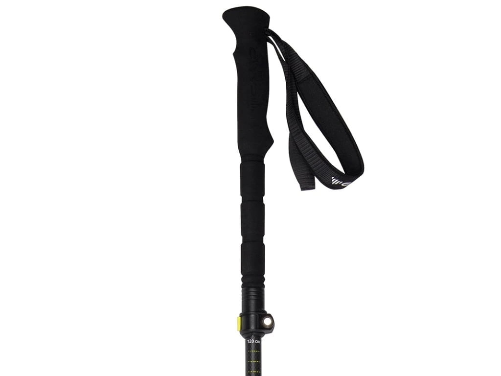 Karbonové segmenty drží nízkou hmotnost a dobrou tuhost, zatímco hliníková slitina ve spojích pomáhá lépe absorbovat nárazy a zvyšuje celkovou odolnost holí při pravidelném používání. Vnitřní ocelové lanko s polyamidovou ochranou zajišťuje pevné spojení segmentů a umožňuje jednoduché nastavení tuhosti. Horní segment je vybavený systémem Alu Fast Lock, díky kterému nastavíš délku v rozmezí 110 až 135 cm rychle a spolehlivě podle terénu i své postavy.