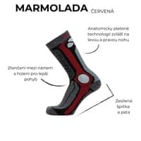 Ponožky Marmolada mají výborné termoregulační vlastnosti (zabraňují přehřátí, zpocení a následnému prochladnutí nohou) a skvěle absorbují a odvádí vlhkost. Část mezi nártem a holení je ztenčená, což přináší větší pohodlí při chůzi. Ponožky Marmolada jsou pletené zvlášť na pravou (R) a levou (L) nohu, aby ti perfektně držely na nohách.