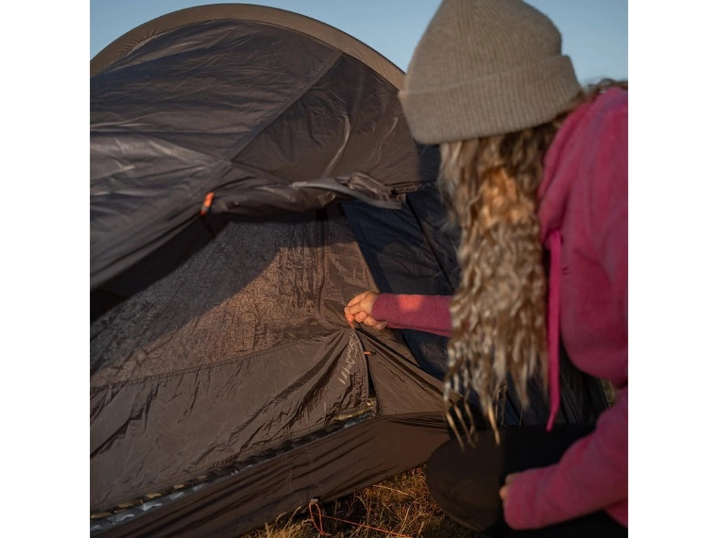 Plášť i podlážka jsou z 20D silikonizovaného ripstop nylonu s vodním sloupcem 3000 mm a podlepenými švy, takže stan dobře chrání před deštěm a mokrým podkladem. Prodyšná vnitřní síťovina a ventilační otvory pomáhají udržet příjemné klima uvnitř i v teplejších nocích. Chytrý detail v podobě vertikální tyče v oblasti nohou přidává prostor, takže se uvnitř necítíš stísněně. YKK zip odolný proti zaseknutí, napínací šňůry z Dyneema, 10 kolíků a opravná sada z něj dělají promyšlený stan do terénu, na který se můžeš spolehnout.