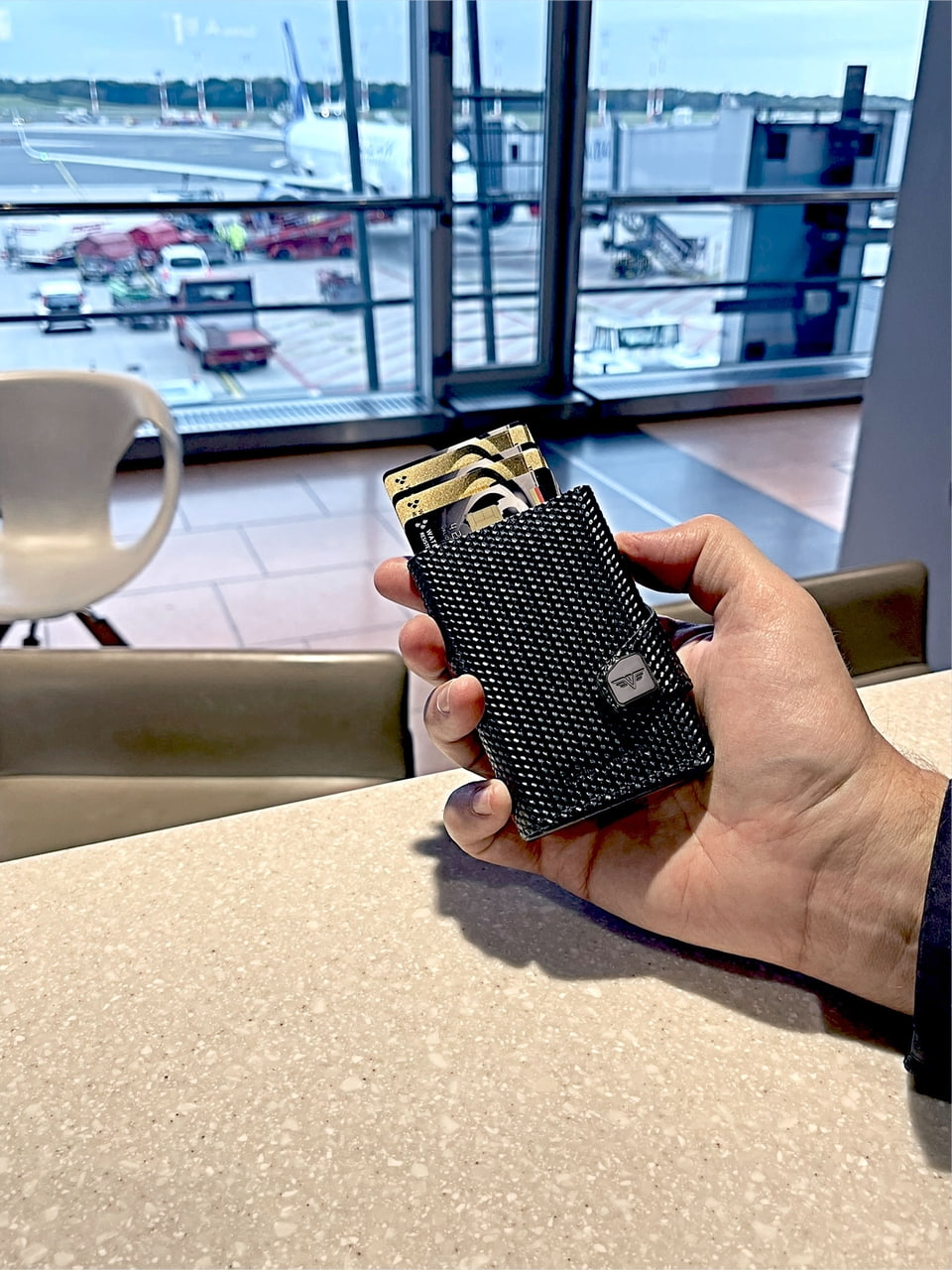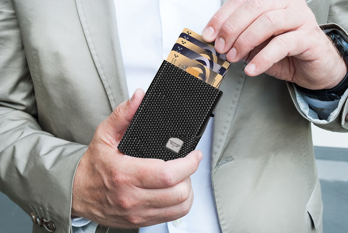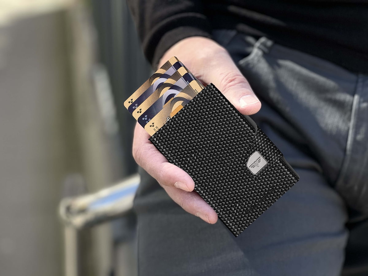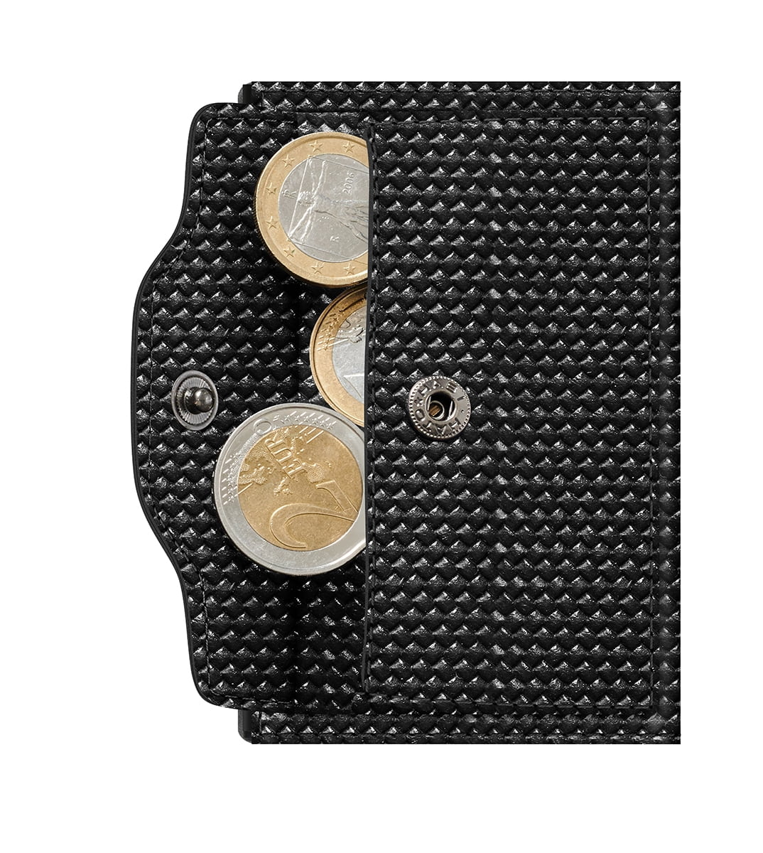 V základním pouzdře máš okamžitý přístup k 5 kartám. Aby mechanismus fungoval správně, je potřeba pouzdro zaplnit minimálně 5 kartami. Pokud používáš EKO karty, může být potřeba více než 5 kusů, pouzdro musí být vyplněné, jinak mohou karty vypadávat. Samostatná část na bankovky a vizitky nabízí prostor i pro další karty, až 7 kusů, takže se vejde všechno důležité na každý den i na cestování. Velkým benefitem této verze je uzavíratelný oddíl na mince, který má vlastní patentované uzavření, takže mince zůstávají bezpečně uvnitř a peněženka zůstává stále elegantní a kompaktní. Ozdobné profilování s reliéfním logem podtrhuje prémiový vzhled a celé provedení je vyrobené v Německu.